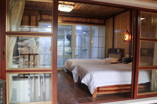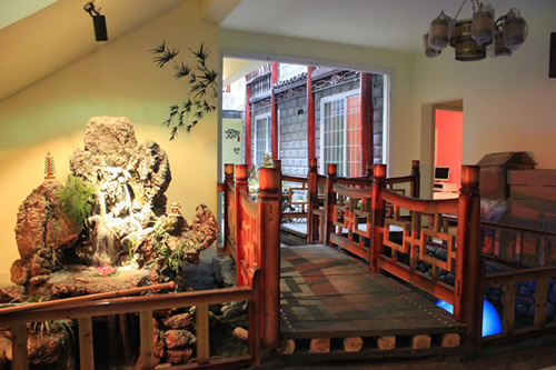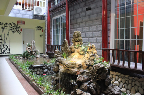 古樸的客房內,超大陽臺全景落地窗,是您欣賞沱江風光帶首選客棧,兩座百年四合院內小橋流水,假山錦鯉,一百三十平米休閑花園別具情調。紅酒加咖啡的大堂吧、彩色精致的情調房、古典高雅的臨江觀景房以及大型公共觀景平臺,龍閣的點點滴滴都透著出古城的神韻和幽靜,走進龍閣客棧,給您一個完美的鳳凰古城沱江全景!