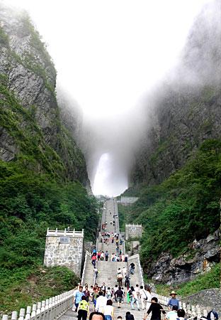 選擇乘索道游覽天門山是最佳視角。索道吊廂一出站房,馬上就騰空飛了起來,從城市的一棟棟樓頂掠過,猶如在城市上空滑翔。翻過一道山梁之后,城市被遠遠拋在了視線以外,大片翠綠的稻田映入眼簾,透過打開的通風窗口,一陣陣青草水田特有的清香沁入心脾;蚋呋虻偷霓r舍不時從我們身下滑過,牛羊們三三兩兩悠閑的在田間浮動著,靜謐、安詳。再翻過一座山峰,我們便立即被滿山的青翠所包圍,萬仞絕壁也已投懷送抱。索道支架矗立于絕壁天險中,或挺立或傾倒或探頭或擁抱,我們繼續(xù)在艱險中游歷,時而隱沒于云堆,時而出世于蒼穹。這時你除了那滿懷的驚險刺激外有的便只有望索而興嘆了。我拍了很多片子,但是總覺得還是沒有足以記錄下來這座空中盆景的壯麗。