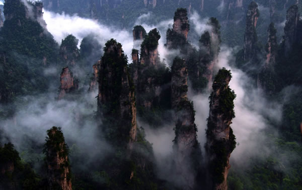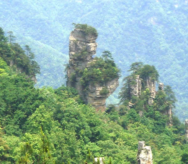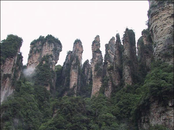 從仙人橋去老屋場,但見深谷里密密麻麻羅列上百座石峰,活像一群威武雄壯的將士列隊(duì)聽令,相傳這是向王天子的神兵在聚會。神話雖不可靠,但石峰如此集中壯觀,在武陵源也屬罕見。我想引用一位美術(shù)大師的話:“豈有此理,莫名其妙,說也不信,到此方知”。不看神兵聚會,怎知石峰成林。