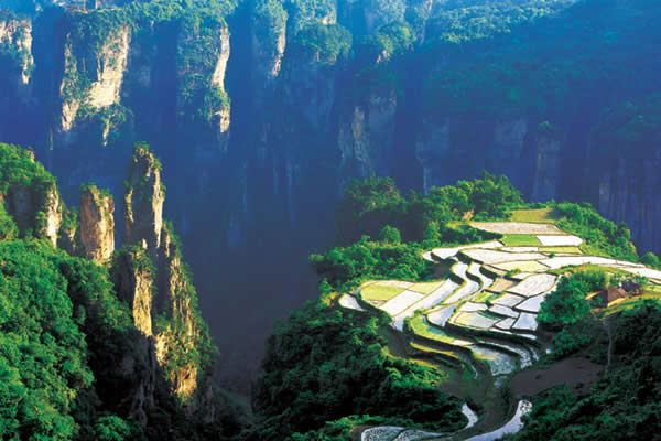 空中田園坐落在天子山莊右側(cè)經(jīng)老虎口、情人路方向兩公里處的土家寨旁,海拔1000余米。它的下面是萬丈深淵的幽 谷,幽谷上有高達(dá)數(shù)百米的懸崖峭壁,峭壁上端是一塊有3公頃大的斜坡梯形良田。田園三方峰巒疊翠,林木參天,白云繚繞,活像一幅氣勢磅礴的山水畫。登上“空中田園”。清風(fēng)拂袖,云霧裹身,如臨仙境,使人有青峰鳴翠鳥,高山響流泉,身在田園里,如上彩云間”之感。