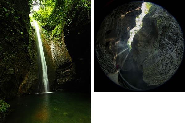 西線原名叫雪花溪,又叫雪花洞,水從懸崖上掉下來濺起水花,泉水與巖石相碰,落成大霧,形成雪花狀,故名雪花溪。因地勢險峻,歷代人都沒有把雪花溪走通過,從下往上看深不見底,古人以為是一個洞,故又叫雪花洞,其實是一個峽谷,有七潭七瀑,現(xiàn)在叫“仙女峽谷”。峽谷長800米,最窄處僅1米左右,上下落差近200米,因水的長期回旋沖刷, 巖層的堅硬度各異,形成了底寬頂窄,時北,時西,時東,陰暗無光,形似溶洞, 泉水飛流直下,形成梯級瀑布,擊打在巖壁上濺起的水花猶如雪花飛舞,潭中一片雪白,古人稱之為雪花洞,峽谷中有七個各異的潭池在沖擊的水花中若隱若現(xiàn),故改稱為七仙女人間沐浴瑤池,從開天辟地起無人行通過,現(xiàn)在已修好的占道,于峽谷水花之中,幻入仙境之感。
