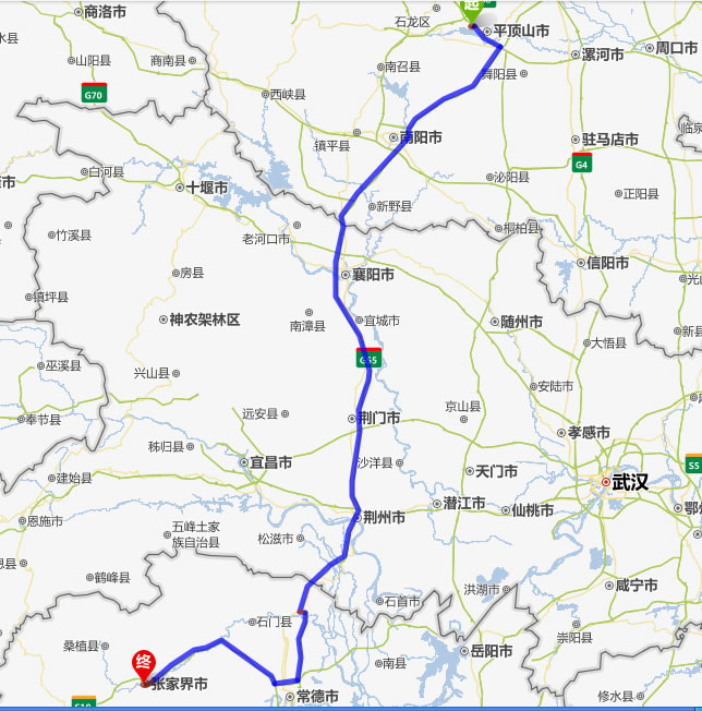 左右,沿途經過平頂山——南陽——襄陽——荊門——荊州——常德(也可以走國道經澧縣、石門縣)——慈利——張家界。