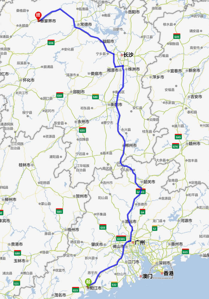 左右,沿途經過陽江——佛山——廣州市——清遠——英德市——韶關市——樂昌市——宜章縣——郴州市——耒陽市——衡陽市——湘潭市——寧鄉(xiāng)縣——益陽市——常德市——慈利縣——張家界。