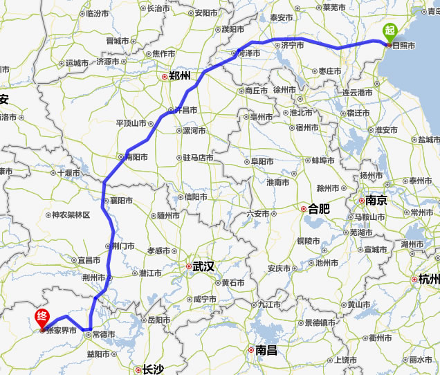 左右,沿途經過日照——平邑縣——濟寧——菏澤——蘭考縣——開封——尉氏縣——許昌市——平頂山——南陽——襄陽——荊門——荊州——常德(也可以走國道經澧縣、石門縣)——慈利——張家界。