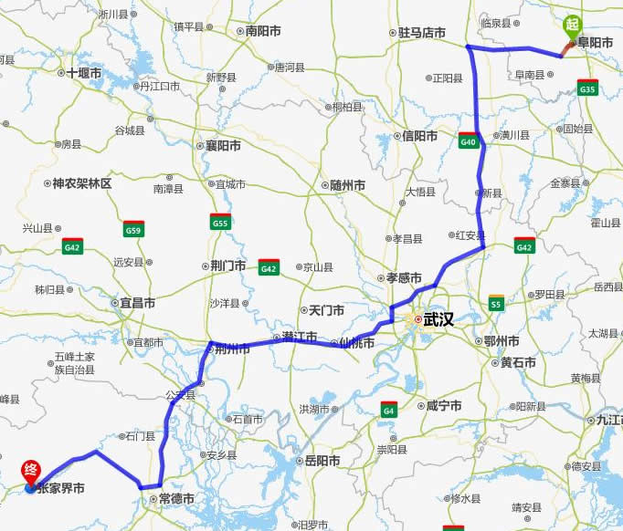阜陽去張家界自駕車自助游線路圖全程高速):